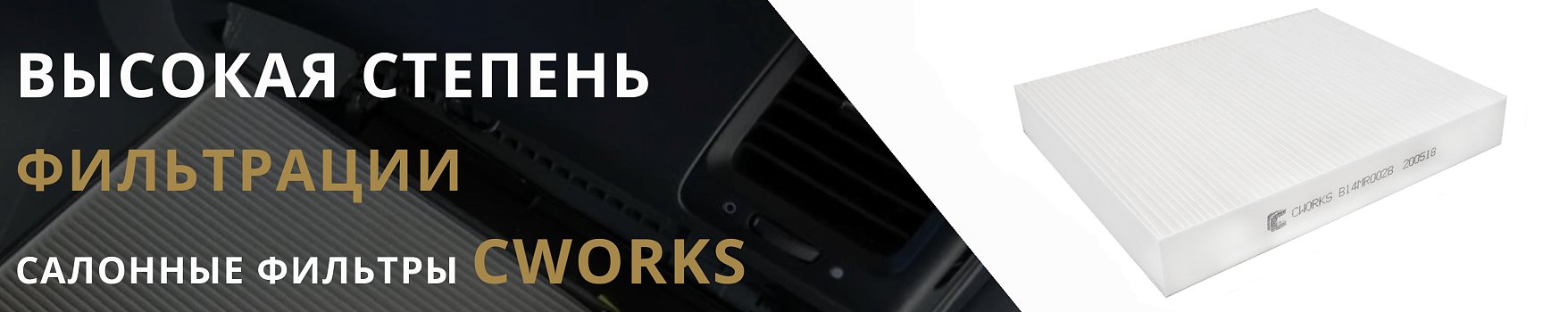 Салонные фильтры CWORKS гарантируют высокую степень фильтрации даже от загрязнений с примесями мельчайших частиц асфальта, сажи, автомобильной резины, соединений тяжелых металлов, пыльцы и других вредных веществ.